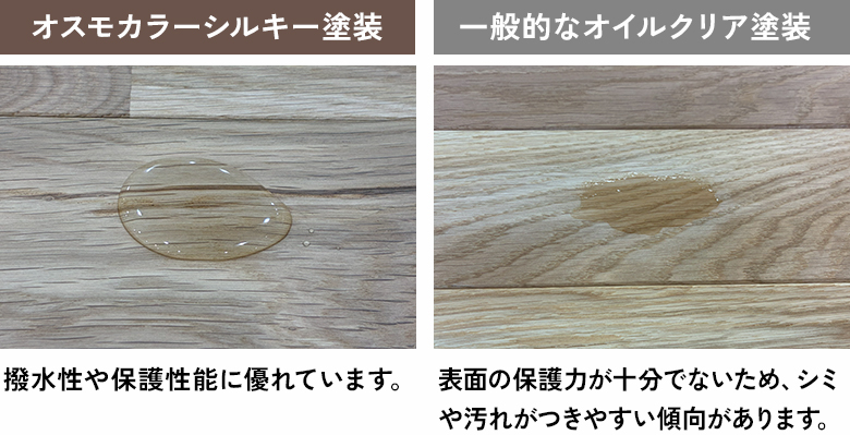 一般的なオイルクリア仕上げでは、表面保護が不十分なため、シミや汚れが残りやすいケースも少なくありません。