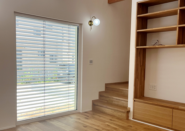 そのような折、工務店から提案を受けた設備に外部ブラインド『ヴァレーマ』がありました。当初は電動シャッターとの違いを十分に飲みこめていませんでしたが、強い風雨を防ぐためのものではないものの、「高気密・高断熱住宅では、窓の外での日射コントロールが家全体の快適性を左右する」との説明を受けて、LDK南面の掃き出し窓に採用することにしました。